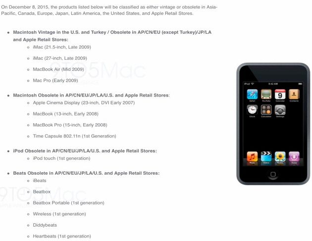 애플, 2015년 12월부터 수리 지원 중단되는 아이팟 및 맥 제품 발표