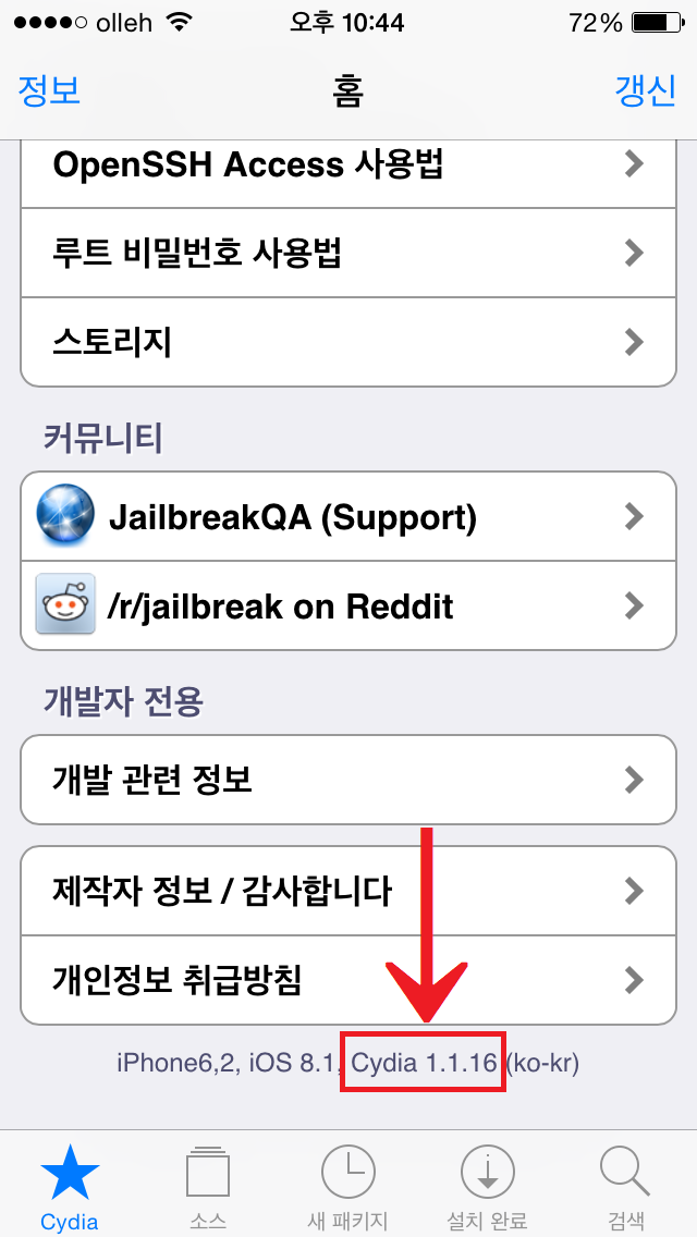 아직 탈옥을 하지 않은 분들은 Pangu8 1.2.1 버전 탈옥툴로 탈옥을 하면 되고, 기존의 탈옥유저들은 시디아에서 업데이트를 하면 됩니다. 시디아 메인화면 하단의 Cydia 버전이 1.1.16으로 나오면 제대로 업데이트가 이루어진 것 입니다.