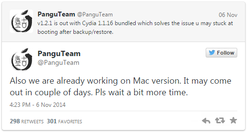 iOS8 완전탈옥툴 Pangu8 버전이 1.2.1로 업데이트 됐습니다. 이번 업데이트에서는 최신 시디아 1.1.16 설치와 함께 백업에서 복원할 때 발생하던 무한사과 문제가 개선되었습니다. 이와 함께 Pangu팀은 Mac버전 탈옥툴도 조만간 출시할 것이라고 트윗을 통해 밝혔습니다.