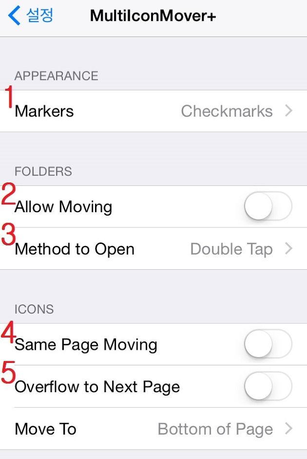 이 버튼을 켜면 폴더가 앱들로 꽉 차있을때 체크한 앱들을 해당 페이지의 위 또는 아래로 이동할 수 있습니다. 앱 이동 위치는 Move To 메뉴에서 변경할 수 있습니다.