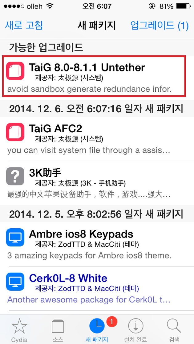 이번 TaiG v1.1.0 탈옥툴로 탈옥한 분들은 따로 Apple File Conduit "2" 트윅을 설치할 필요가 없습니다. 기존의 TaiG v1.0.2 이하 탈옥툴로 탈옥한 분들은 시디아에서 TaiG 팀의 공식 소스를 추가해 TaiG 8.0-8.1.1 Untether 트윅을 설치하면 굳이 재탈옥을 하지 않아도 됩니다.