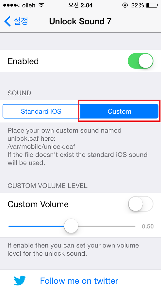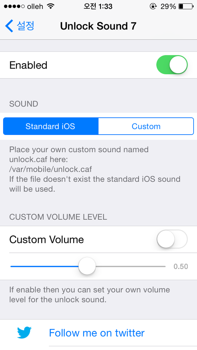 이번에 소개할 트윅은 UnlockSound7 입니다. iOS6까지 있었던 밀어서 잠금해제 효과음이 iOS7 업데이트 후 없어졌는데요. 이 효과음을 다시 낼 수 있게 해주는 시디아 트윅입니다.