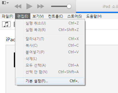 STEP1. 아이튠즈를 실행합니다. 그리고 상단 메뉴 중 편집(E)-기본 설정(F)을 클릭합니다.