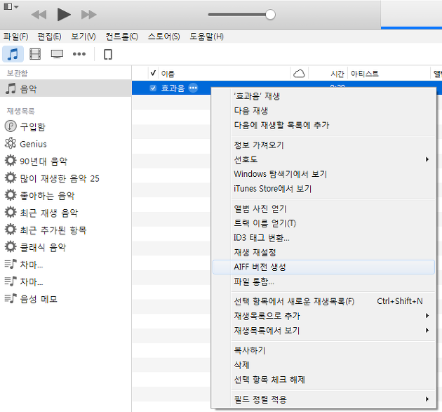 STEP5. 파일(F) 메뉴 밑의 ♬(음악)을 클릭합니다. 그리고 STEP4에서 추가한 MP3 파일에서 마우스 오른쪽 버튼을 누른 후 AIFF 버전 생성을 클릭합니다.