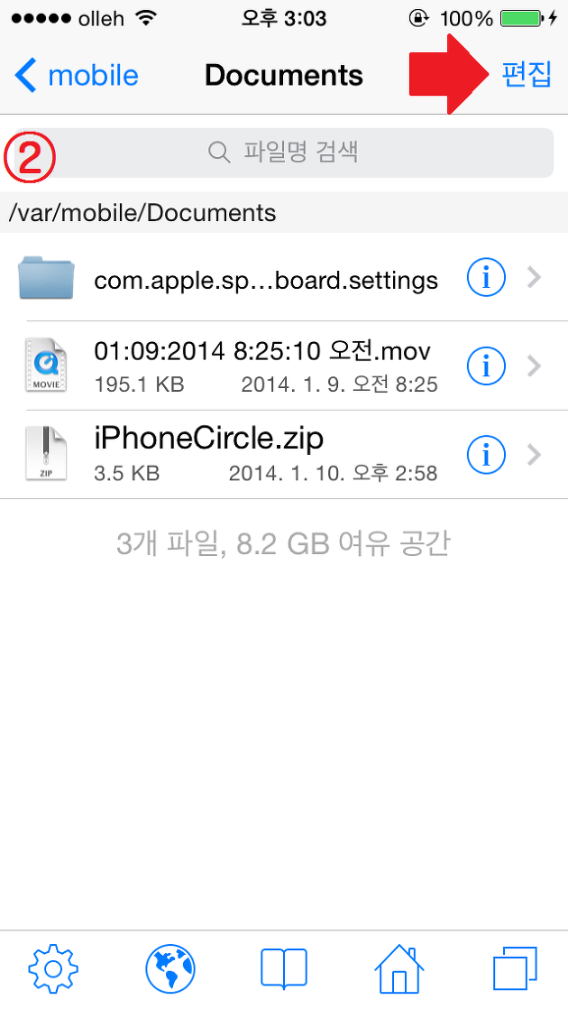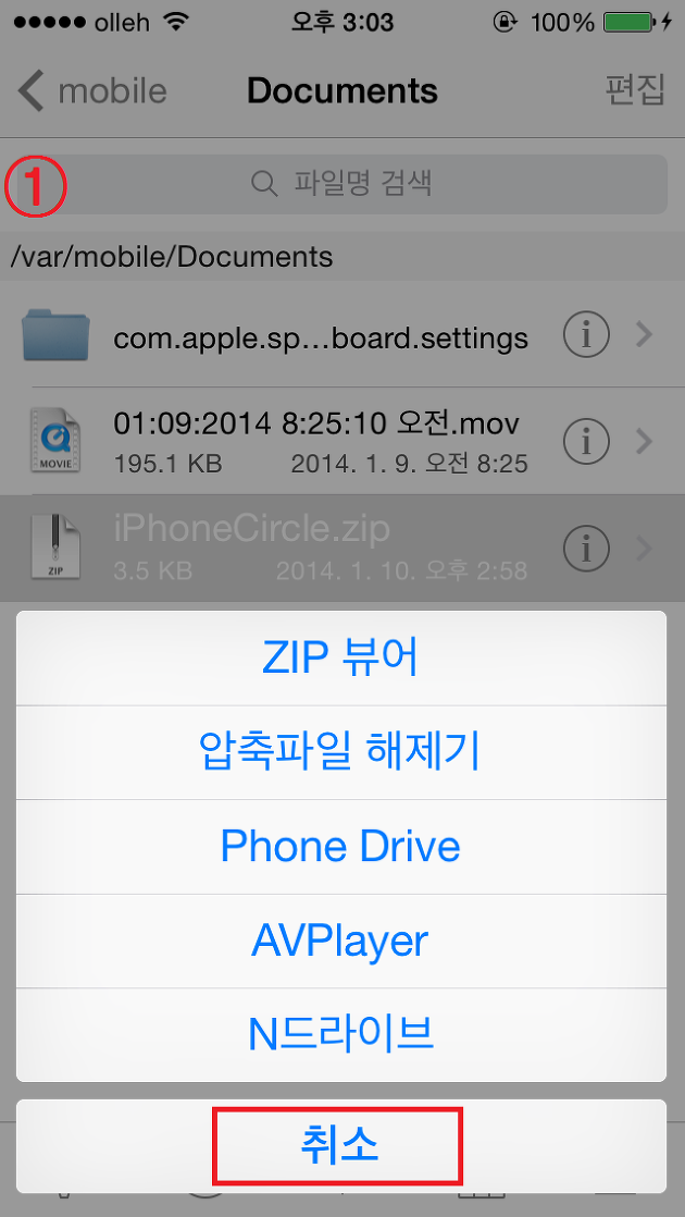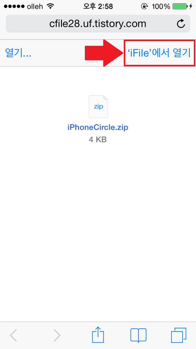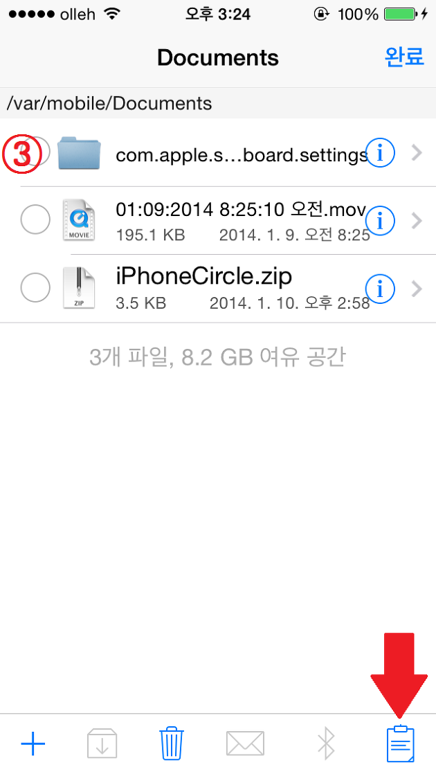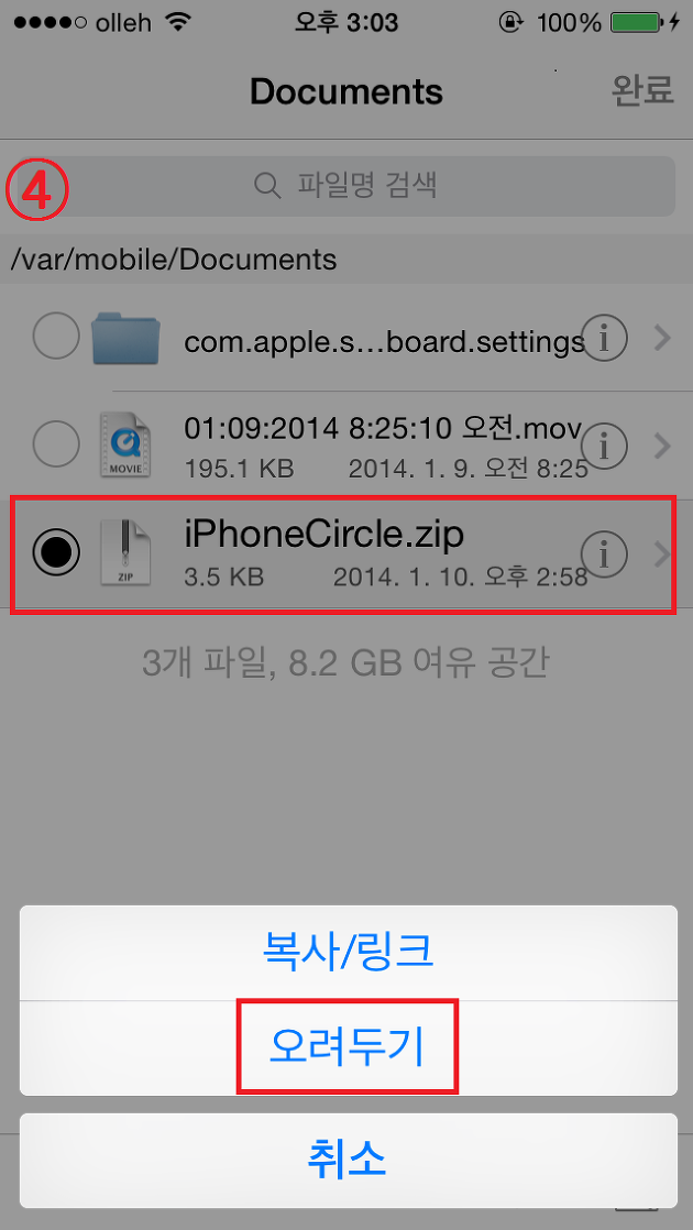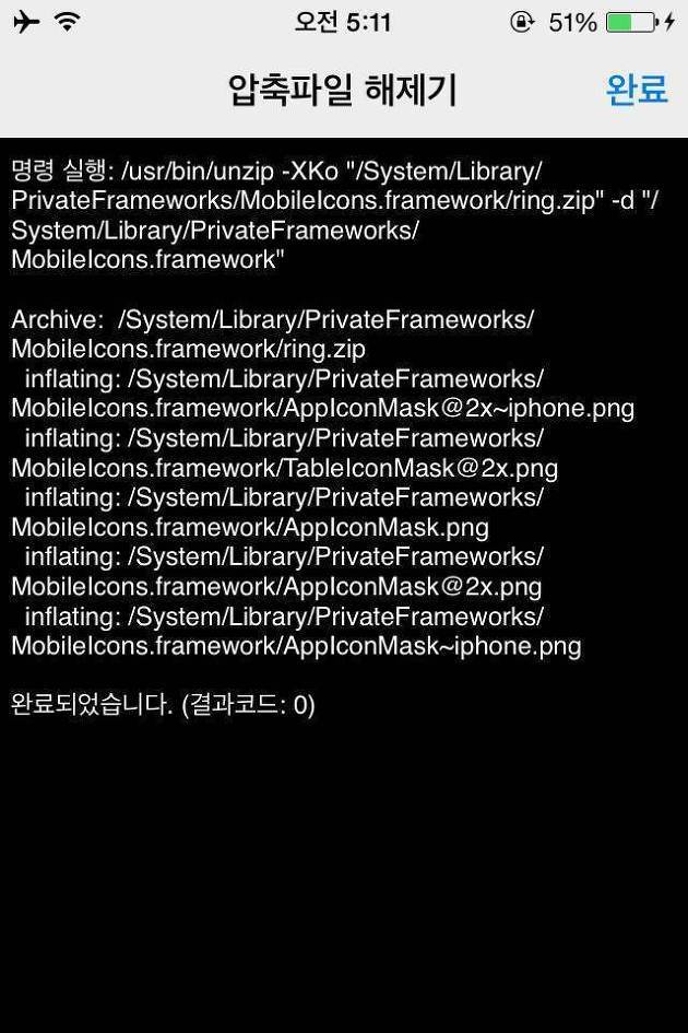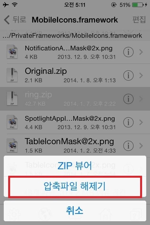 STEP3. 아이폰에서 iFile을 실행합니다. 그리고 STEP2에서 얘기한 경로로 들어가 바꾸고 싶은 어플 아이콘 모양의 압축파일을 선택 후 압축파일 해제기를 누른 다음 화면 상단 오른쪽의 완료를 누릅니다.