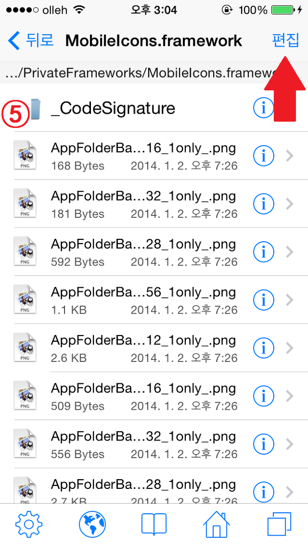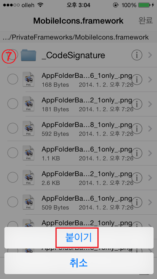 STEP2. 아이폰의 사파리로 이 페이지를 열어 위에 첨부한 압축파일을 터치해 다운로드 받은 다음 iFile 트윅을 이용해 다운받은 파일을 /System/Library/PrivateFrameworks/MobileIcon.framework/ 폴더 안에 붙여넣기 합니다.