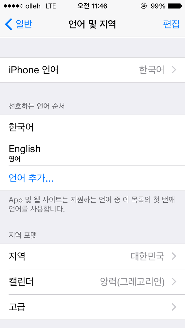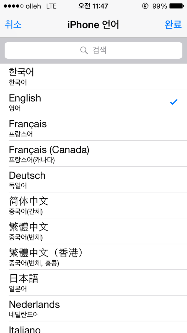 STEP4. 아이폰의 설정>일반>언어 및 지역에서 iPhone 언어를 다른 나라의 언어로 바꾸고 완료를 누릅니다.