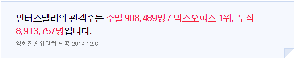 최근 Hot한 영화를 꼽으라고 하면 관객수 천만 돌파를 눈 앞에둔 크리스토퍼 놀런 감독의 SF 영화, 인터스텔라입니다. 미국에서는 비난과 혹평 속에서 그리 좋은 성적을 거두지 못한 이 영화가 국내에서는 개봉된지 한달이 넘은 지금까지, 러닝타임이 거의 3시간에 가까움에도 불구하고 이렇게 흥행하는 이유를 지인들은 이렇게 말합니다.