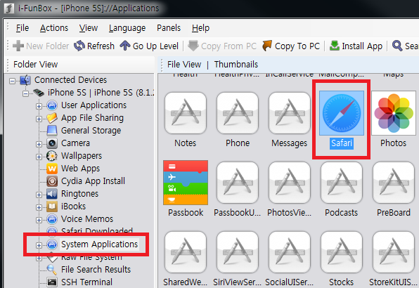 ※ 아이펀박스를 이용할 경우 아래 그림과 같이 System Applications를 클릭한 후 Safari를 더블클릭한 다음 거기에 위 파일을 저장(덮어쓰기)하면 됩니다.