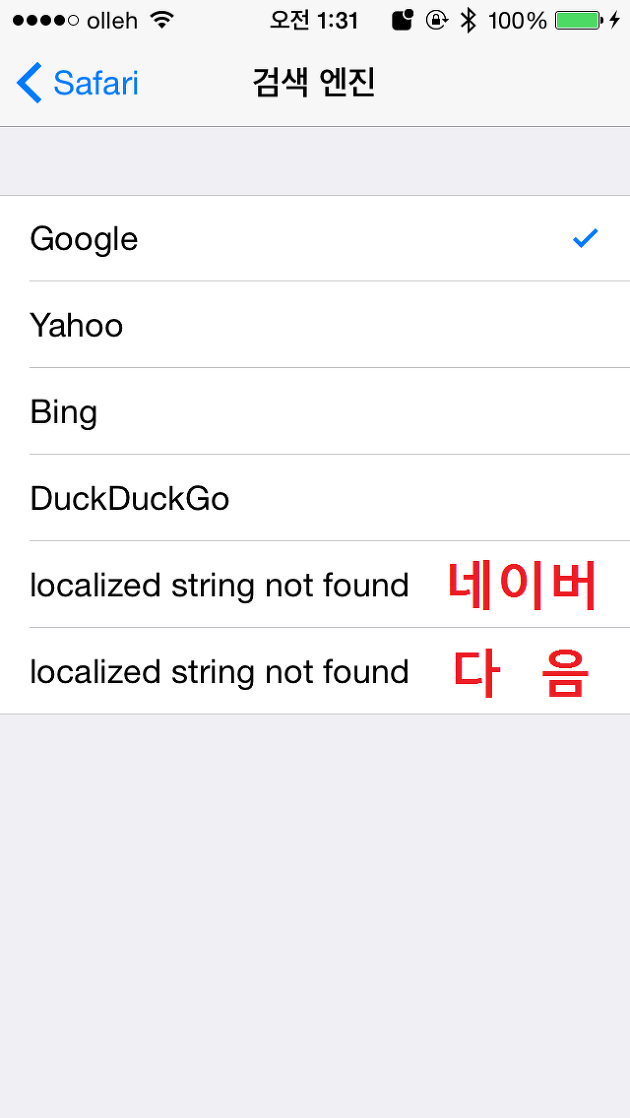 네이버와 다음 2개 모두 기본 검색엔진으로 사용할 경우 설정>Safari>검색 엔진에 localized string not found 가 2개 생깁니다. 이때 아래의 localized string not found 를 선택한 다음 나갔다가 다시 설정>Safari>검색 엔진으로 들어가 보면 위의 localized string not found 에 체크표시가 되어 있는 것을 볼 수 있습니다. 그렇다하더라도 사파리 기본 검색 엔진은 Daum으로 설정된 것이니 참고하시기 바랍니다.