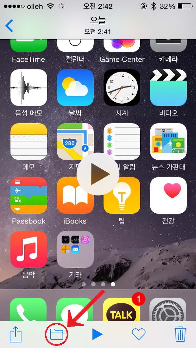 트윅 설치 후 설정이나 홈화면에 메뉴 또는 아이콘이 생기지는 않습니다. 사용법은 간단한데요. 카메라 롤에 들어간 후 다른 앱으로 전송하고 싶은 사진이나 동영상을 선택합니다. 그리고 아래 그림과 같이 화면 하단 왼쪽의 버튼을 눌러 전송하고자 하는 앱을 선택하면 됩니다.
