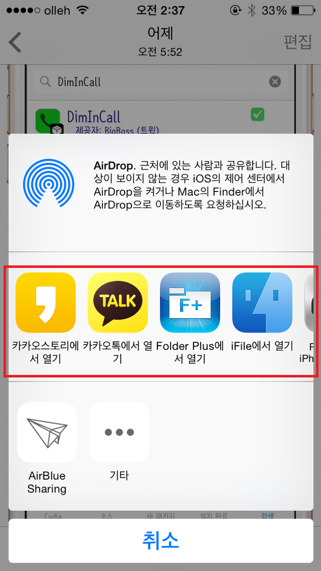 이번에 소개할 트윅은 Open In App For Photos 인데요. 이 트윅은 카메라 롤에 저장된 사진, 동영상을 카톡 등 다른 앱으로 전송해주는 트윅입니다.