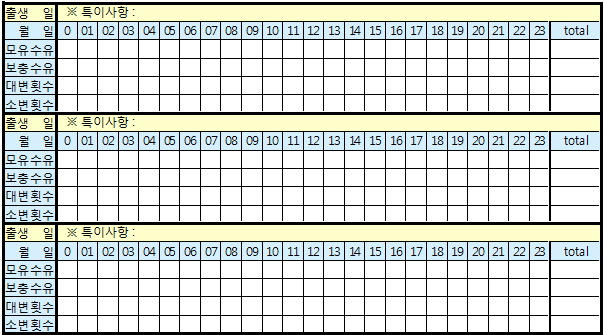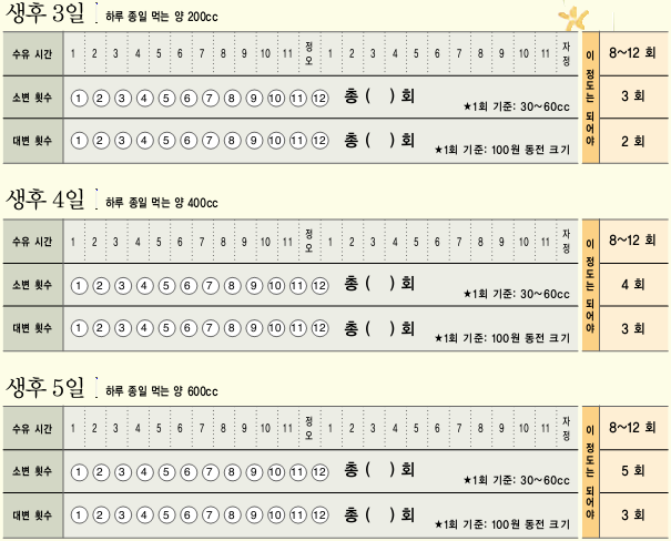 첫 줄에는 출생 몇일째인지를 적고, 특이사항란에는 아기의 변 이상유무(변색깔이 이상하다든지, 내용물이 이상하다든지 등등) 혹은 수유량이 적다 혹은 많다 등을 적으시면 됩니다.
