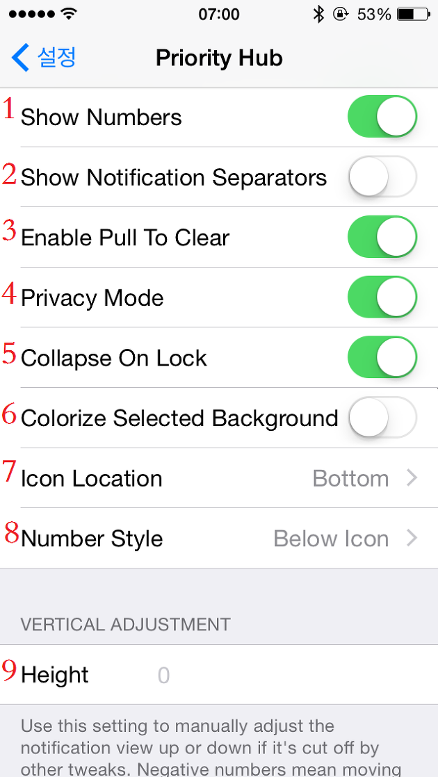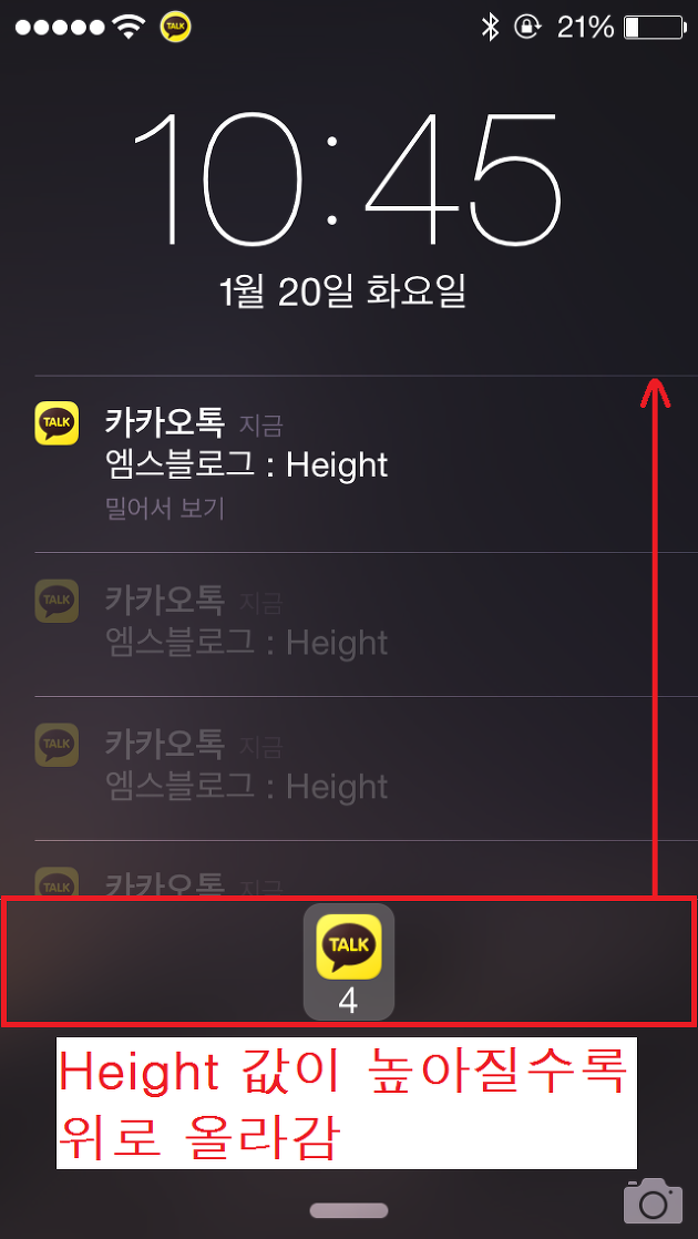 9. Height : 앱 알림 내용의 높이를 조절할 수 있는 메뉴로 높이의 최소값은 0, 최대값은 240입니다. 240보다 높은 숫자를 입력해도 되지만 그럴 경우 앱 알림 아이콘이 안보이게 됩니다.