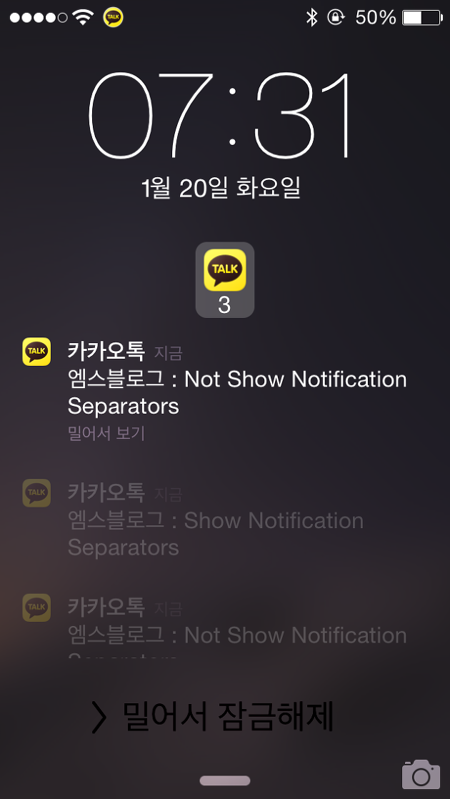 2. Show Notification Separators : 각각의 앱 알림 내용에 구분선 표시 설정 버튼으로 아래 그림 중 왼쪽이 버튼을 켠 화면입니다.