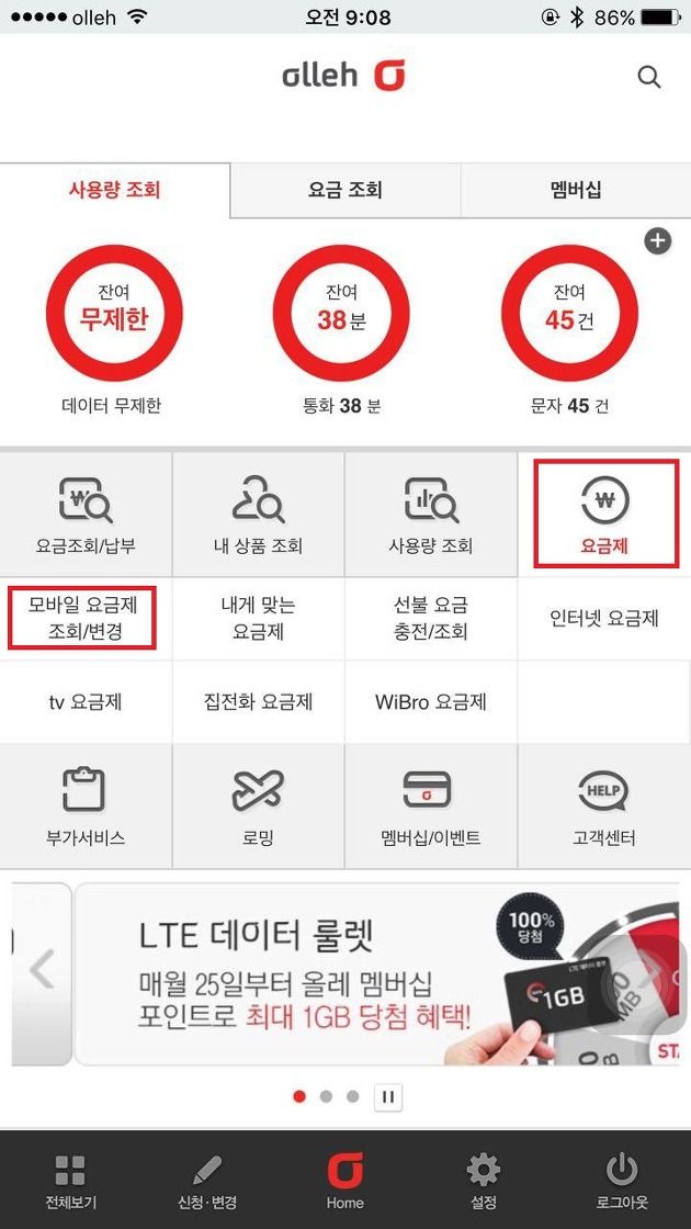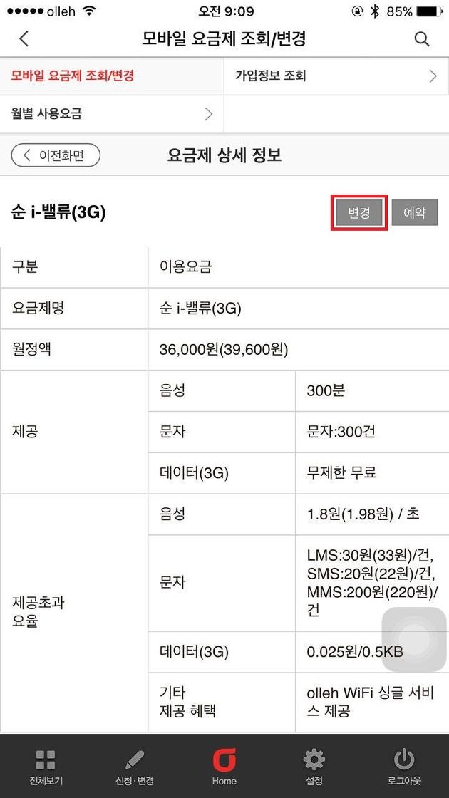 ▶ 사용중인 요금제→요금제>모바일 요금제 조회/변경 메뉴