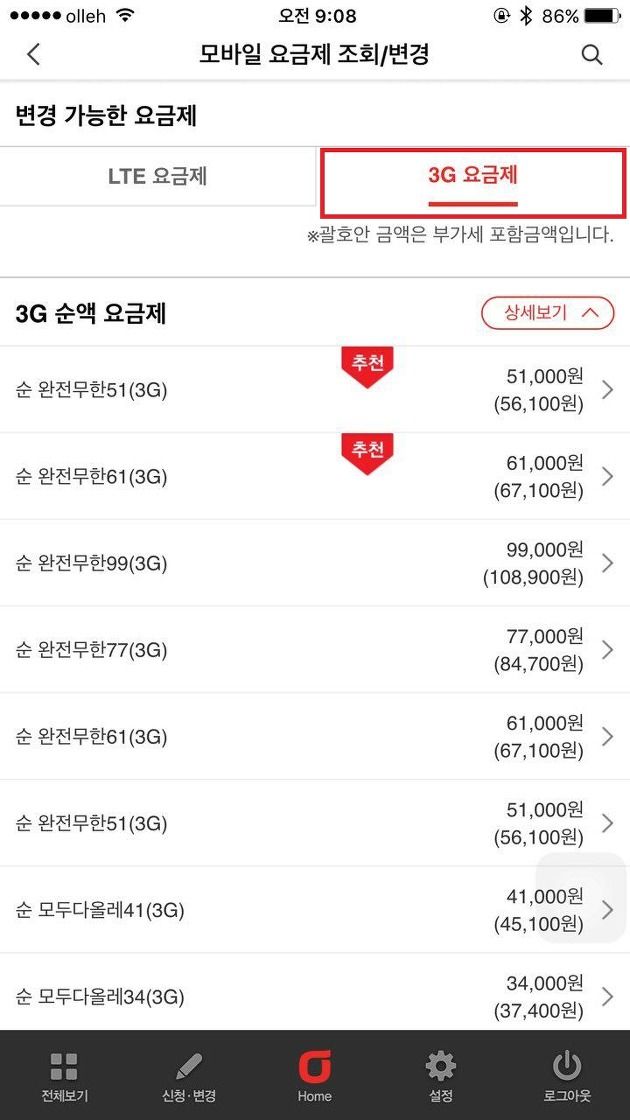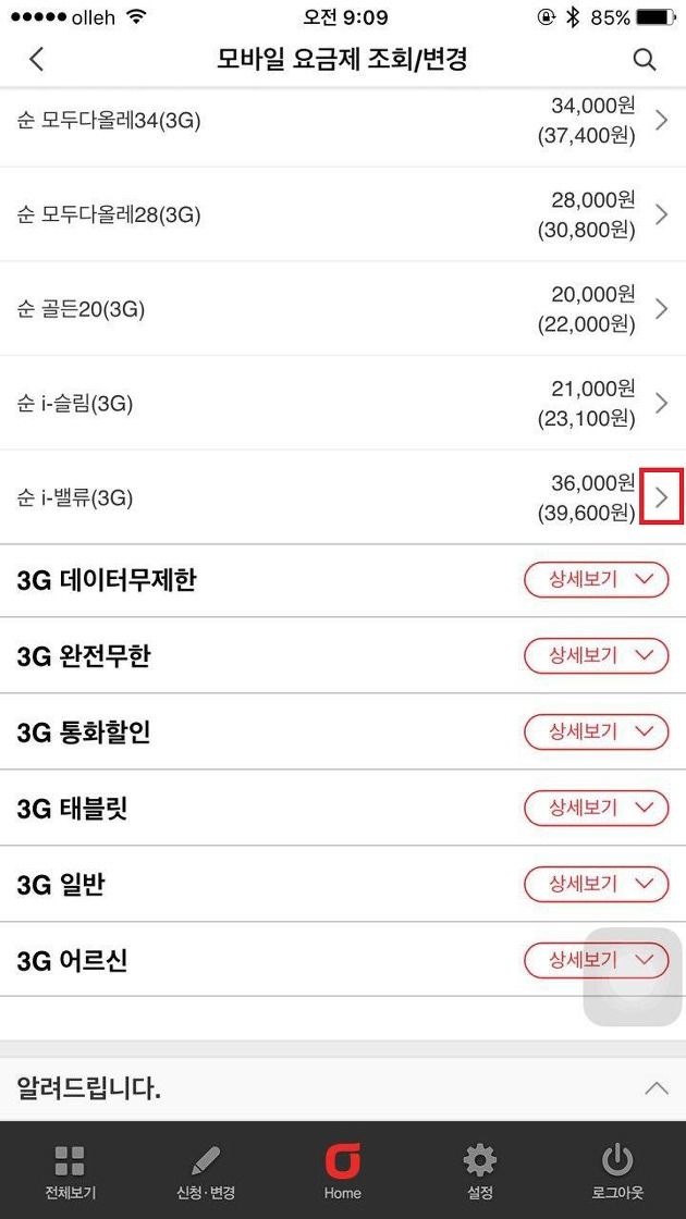 요금제 변경은 114 전화 뿐만 아니라 올레 고객센터 앱을 이용해도 변경을 할 수 있는데요. 요금제>모바일 요금제 조회/변경>3G 요금제를 선택한 다음, 변경하고자 하는 요금제의 오른쪽 끝에 있는 >를 터치하면 됩니다.
