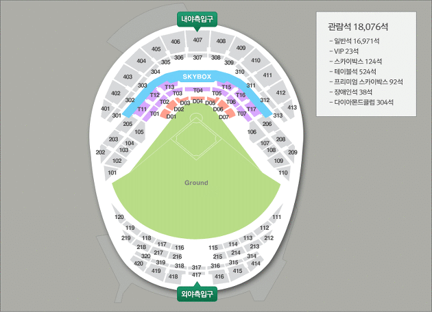 국내 최초 돔구장인 고척 스카이돔에 대해 알아보자면 위치는 이름에서 알 수 있듯이 서울시 구로구 고척동에 있으며, 최대 수용 인원은 18,092명(내야 11,657석 / 내야 테이블석 524석 / 외야 5,314석 / 회전형 장애인석 38석 / 스카이박스 216석 / 다이아몬드석 304석)이고 문화 행사시에는 2만5천명까지 수용가능하다고 합니다.(생각보다 수용인원이 적은 것은 매우 안타깝습니다.) 좌우 펜스까지의 거리는 99m, 센터까지는 122m이고 펜스높이는 4m로 경기장 규모는 잠실 구장보다 약간 작습니다.