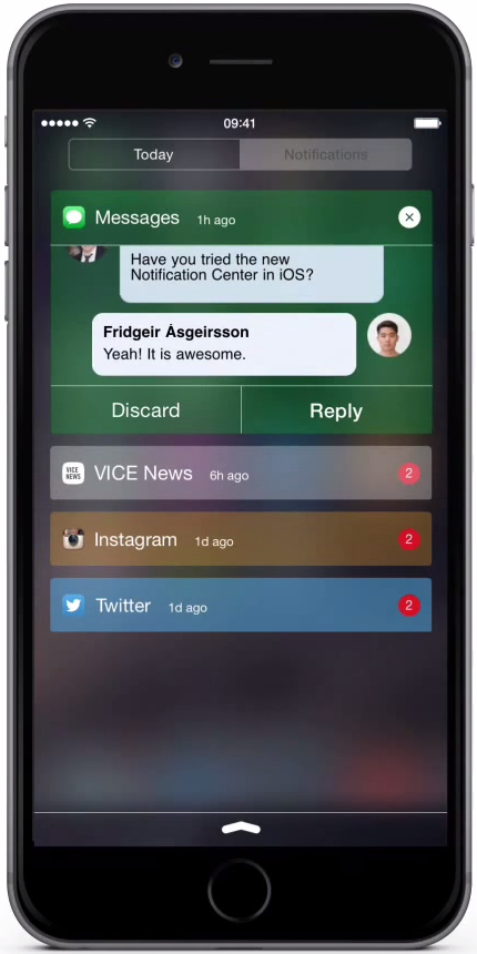 iOS9의 알림센터 컨셉 영상입니다. iOS8 알림센터에서는 앱 알림 내용을 확인하는 정도의 용도였다면 iOS9에서는 내용 확인 뿐만 아니라 간단한 조작까지 가능하다는 점이 특징입니다. 또한 알림 내용을 쭈~욱 길게 나열한 iOS8에 비해, 앱별로 알림 내용을 접을 수 있는 점도 특징입니다. 그러나 어디까지나 컨셉 영상이라는 점 참고하면서 보세요.