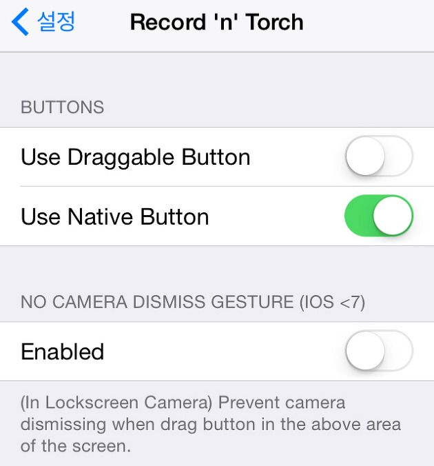트윅 설치 후 설정에 Record 'n' Torch 메뉴가 생기는데요. 거기서 동영상 촬영 중 사용할 플래시 버튼을 활성화 할 수 있습니다.