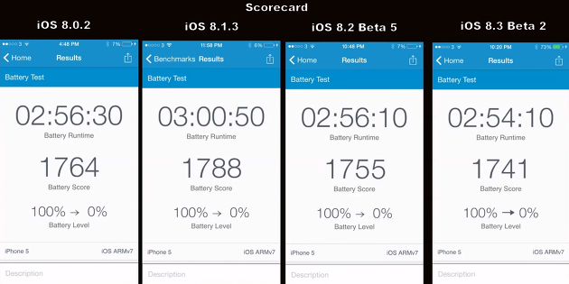 아이폰5 16GB를 대상으로 iOS8.0.2와 iOS8.1.3, iOS8.2 베타5, iOS8.3 베타2 이렇게 4가지 버전별 배터리 성능을 테스트했습니다. 배터리 테스트는 프로세서 실행 속도 측정 앱으로 유명한 Geekbench를 사용해 측정했는데요. 결과는 아래의 영상에서 자세히 확인할 수 있습니다.
