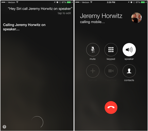 그러나 이 부분이 iOS 8.3 버전에서는 개선되었습니다. "시리야" 기능을 이용해 스피커 모드로 전화 통화를 원할 경우 "○○에게 스피커 모드로 전화해" 또는 "○○에게 스피커폰으로 전화해"라고 얘기하면 자동으로 스피커폰으로 통화 연결이 됩니다.