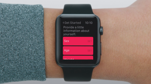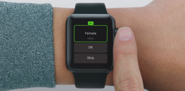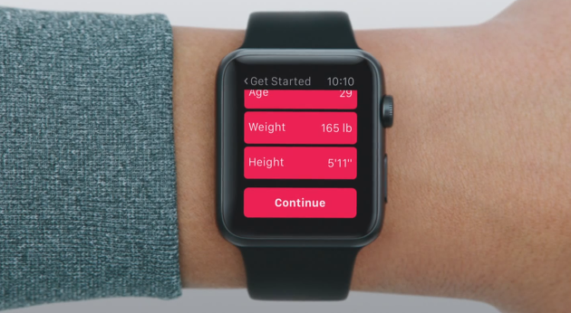 성별, 나이, 키, 몸무게 등의 정보를 입력합니다. 각 항목별 정보 입력 시 디지털크라운을 위 아래로 돌려 선택하면 됩니다. 항목별 정보를 모두 입력했다면 맨 아래의 Continue 버튼을 누릅니다.