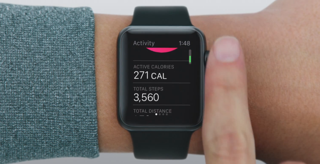 애플워치 홈화면을 위로 올리거나 화면 하단 왼쪽의 아이콘을 터치하면 Activity 화면을 볼 수 있는데요. 디지털크라운을 위로 돌리면 칼로리, 걸음수, 총 이동거리 등의 정보를 볼 수 있으며, 화면을 왼쪽으로 쓸어넘기면 앞서 설정한 목표에 어느 정도 도달했는지 그래프로 볼 수 있습니다.