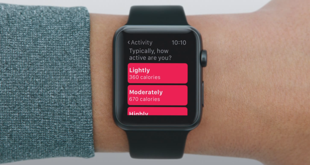 사용자 정보 입력 후 Activity 목표 설정 화면이 나오는데요. 활동량에 따라 Lightly / Moderately / highly 중에서 선택하고 하루 목표 칼로리를 디지털 크라운을 이용해 설정한 뒤 Start Moving 버튼을 누르면 완료됩니다.