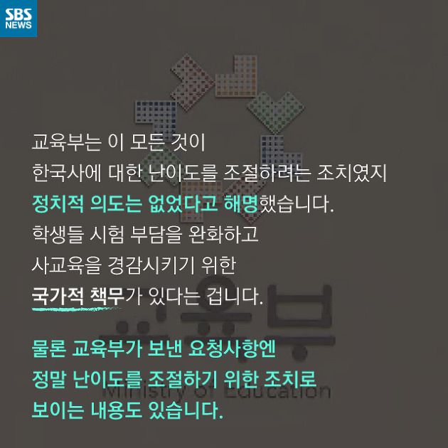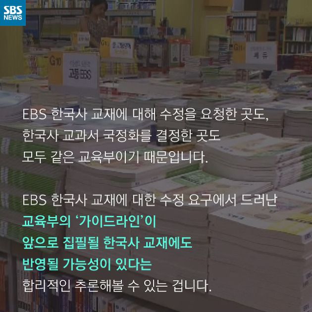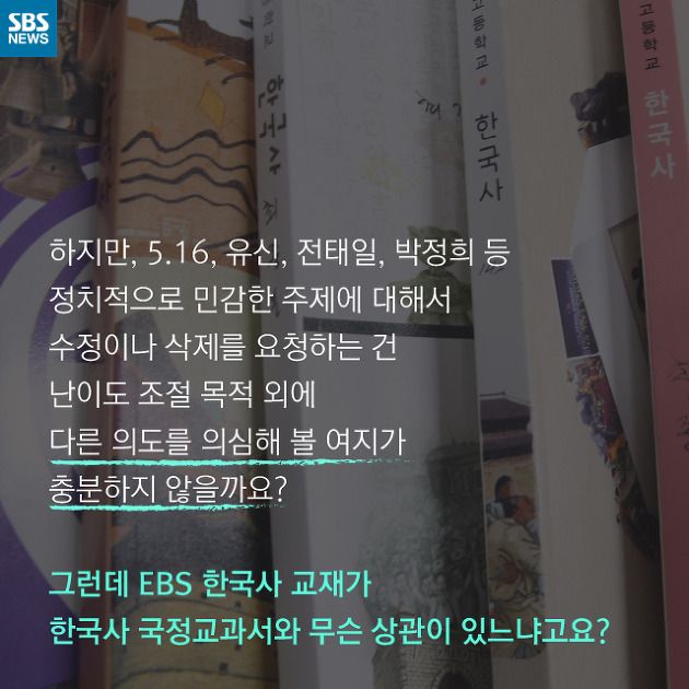 지난해 9월에 있었던 교육부의 EBS 한국사 교재에 대한 수정 요구 사건을 보면 어느 정도 가이드 라인은 합리적으로 추론해 볼 수 있습니다. 지난해 9월에는 무슨 일이 있었던 걸까요? 아래의 SBS 뉴스가 만든 카드뉴스로 확인해 볼까요?