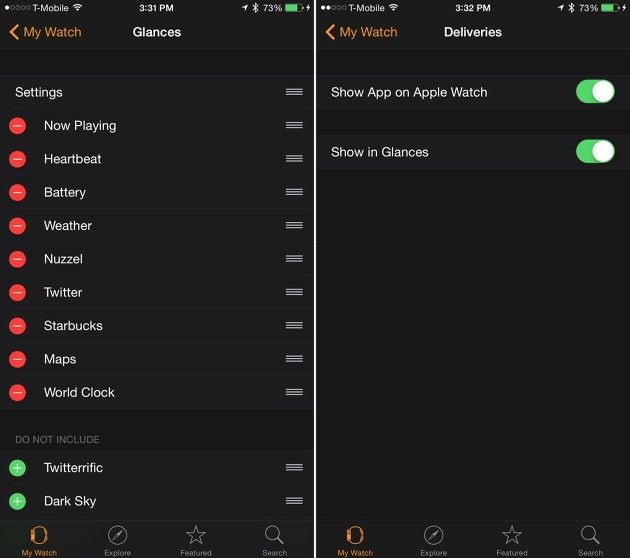 또한 Apple Watch>My Watch에서 화면을 아래로 내려보면 앱목록들이 나오는데 앱목록을 터치하면 '한눈에 보기'의 사용여부를 설정하는 화면이 나옵니다.(Show App on Apple Watch / Show in Glances) 거기서 앱 개별적으로 설정이 가능하니 참고하시기 바랍니다.